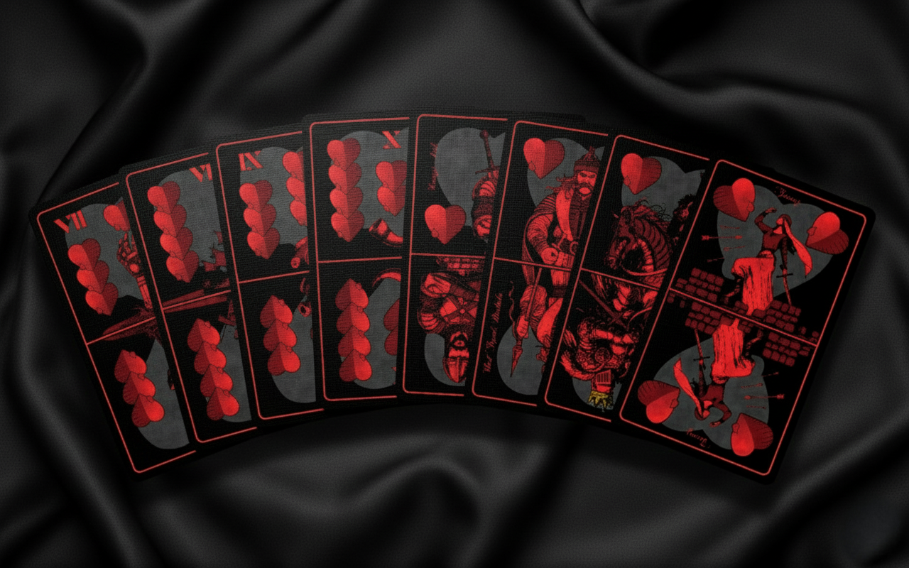 A Szív a vörös vérrel áztatott rónákon robajló háborúk kártyai. A lapok a vég nélküli erőszak körforgását mutatják: ott, hol a bátorság testvérre lel a kegyetlenségben, s a diadal és bukás örök körforgásban fonódik össze.